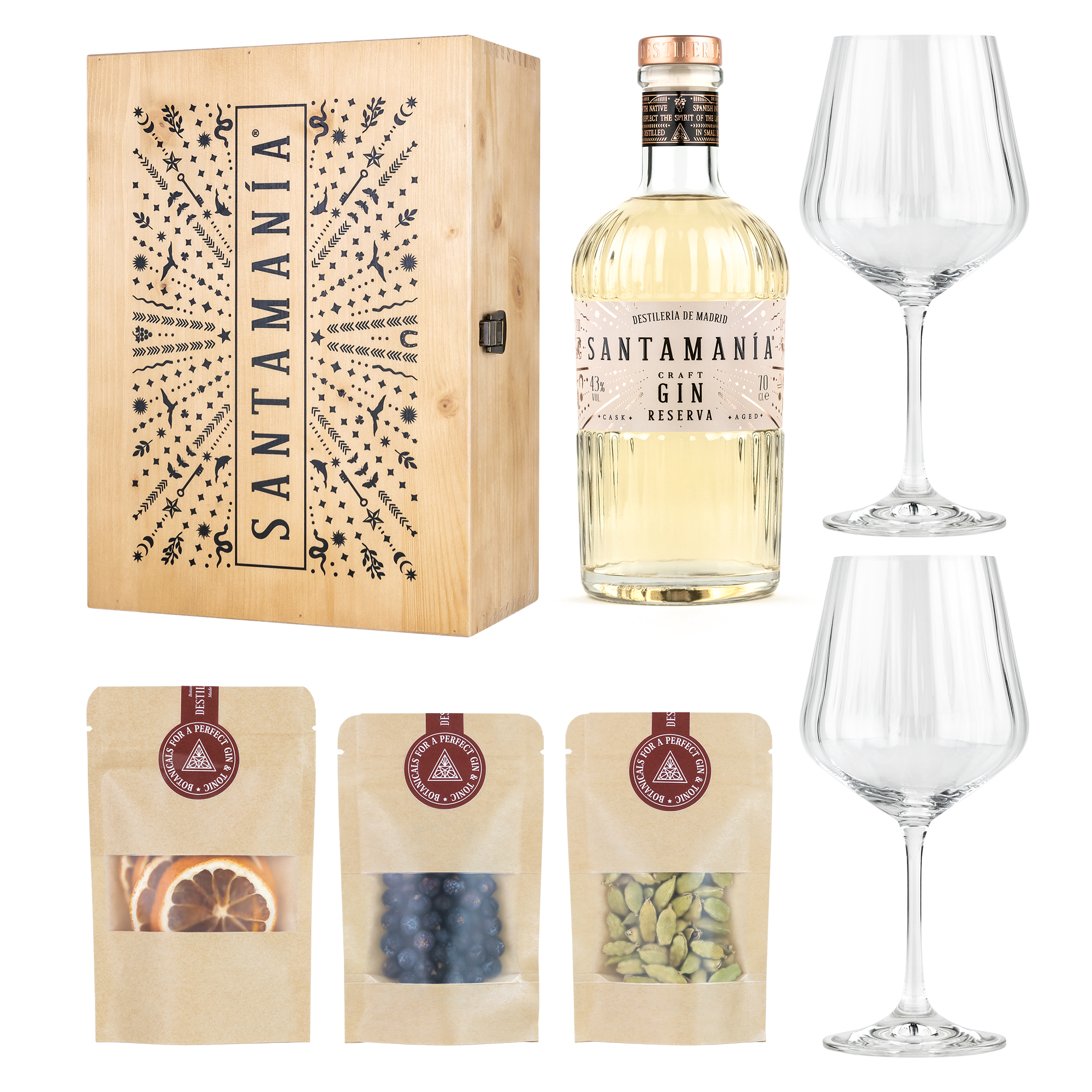 Elegante caja de madera que incluye una botella de SANTAMANIA GIN RESERVA, dos copas de balón de cristal y una selección de botánicos para preparar el gin and tonic perfecto.